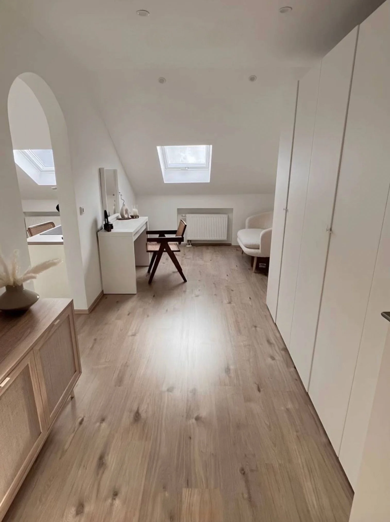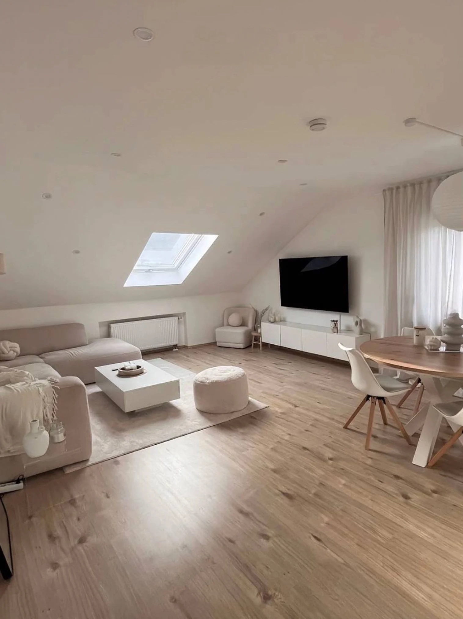 Minimalist modern living room with white walls, light wood flooring, a flat-screen TV, a circular dining table with white chairs, a white sofa with cushions, and a skylight window in the ceiling.